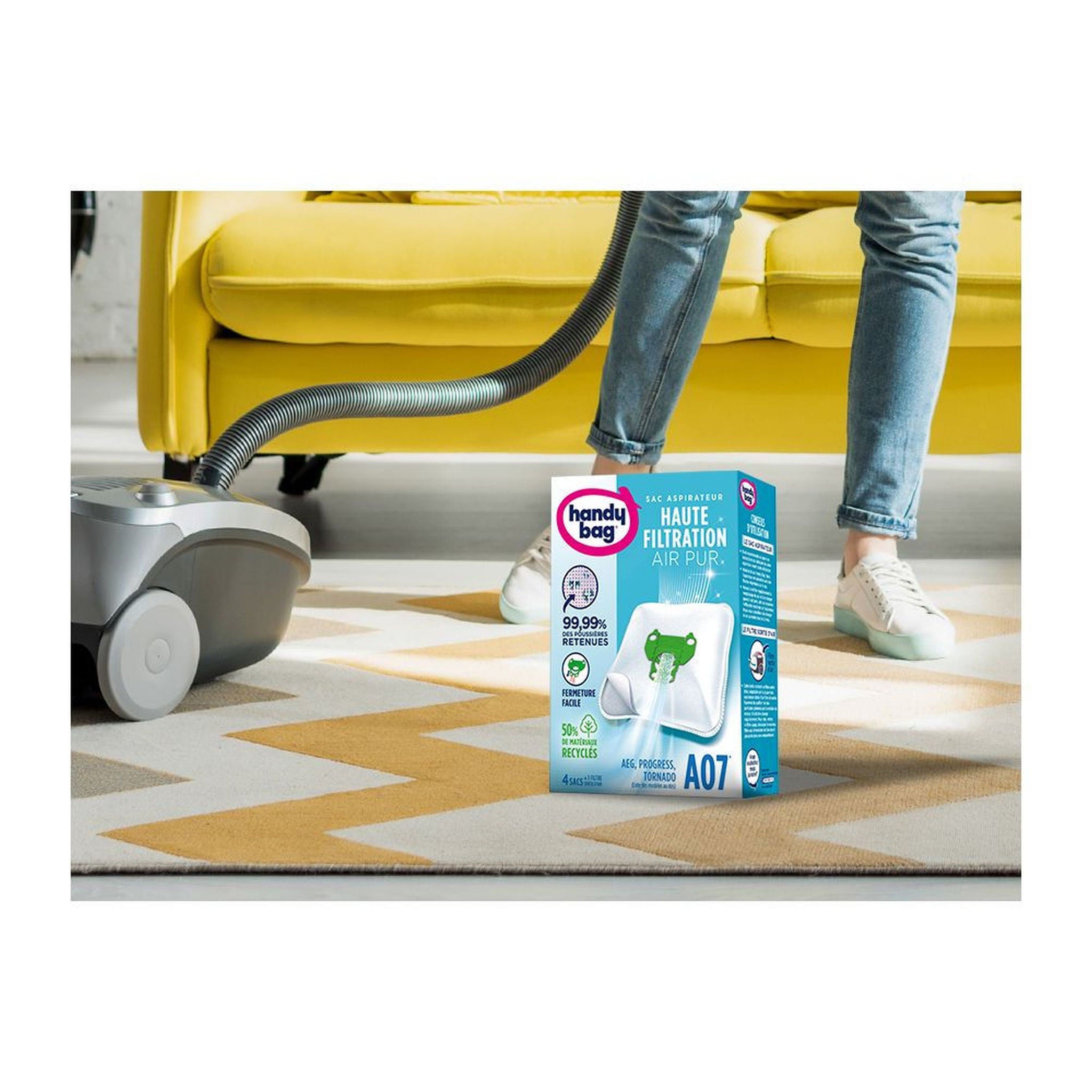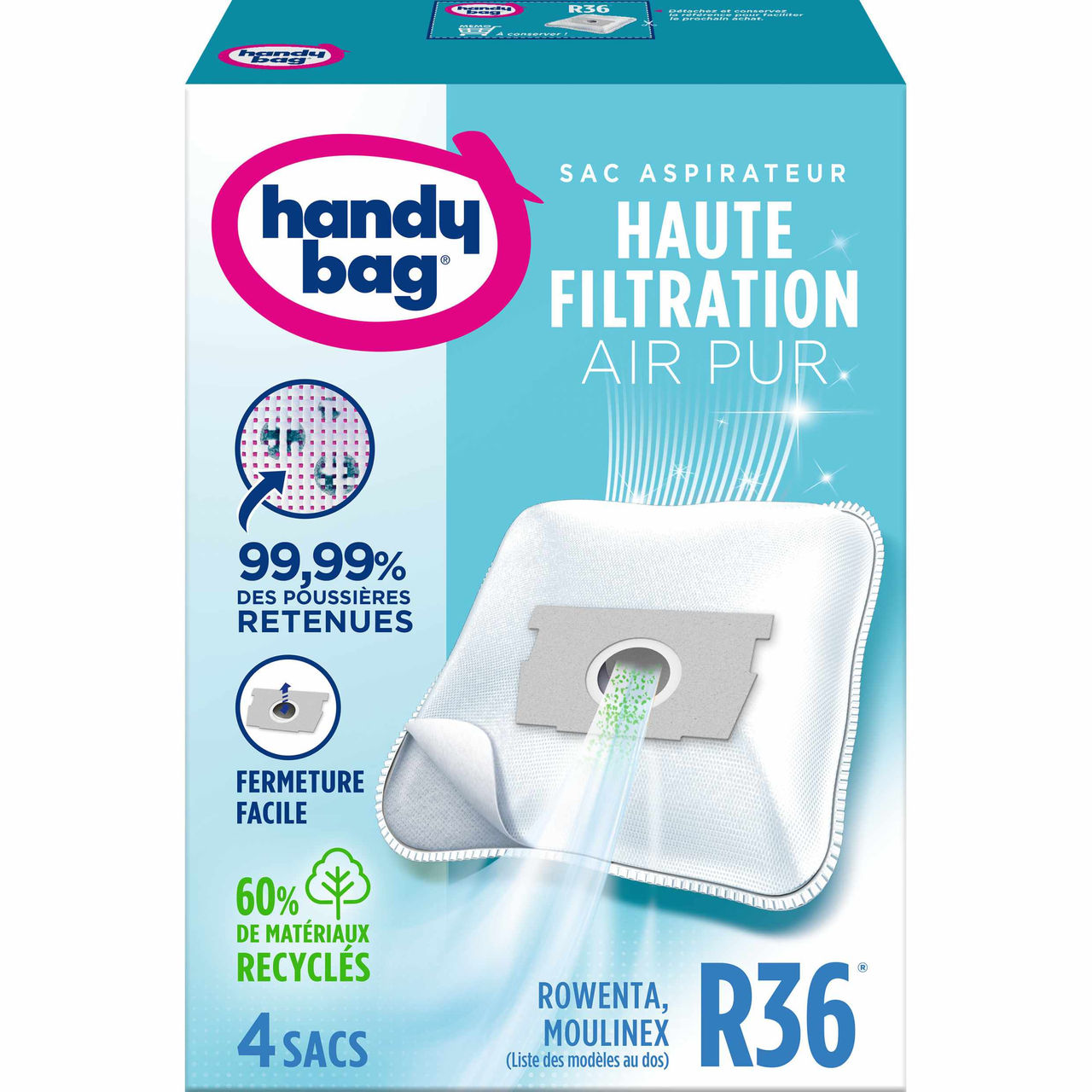 Nos sacs aspirateur Handy Bag® Haute Filtration vous garantissent une puissance d'aspiration maximale, et retiennent 99,99 % des particules de poussières les plus fines.