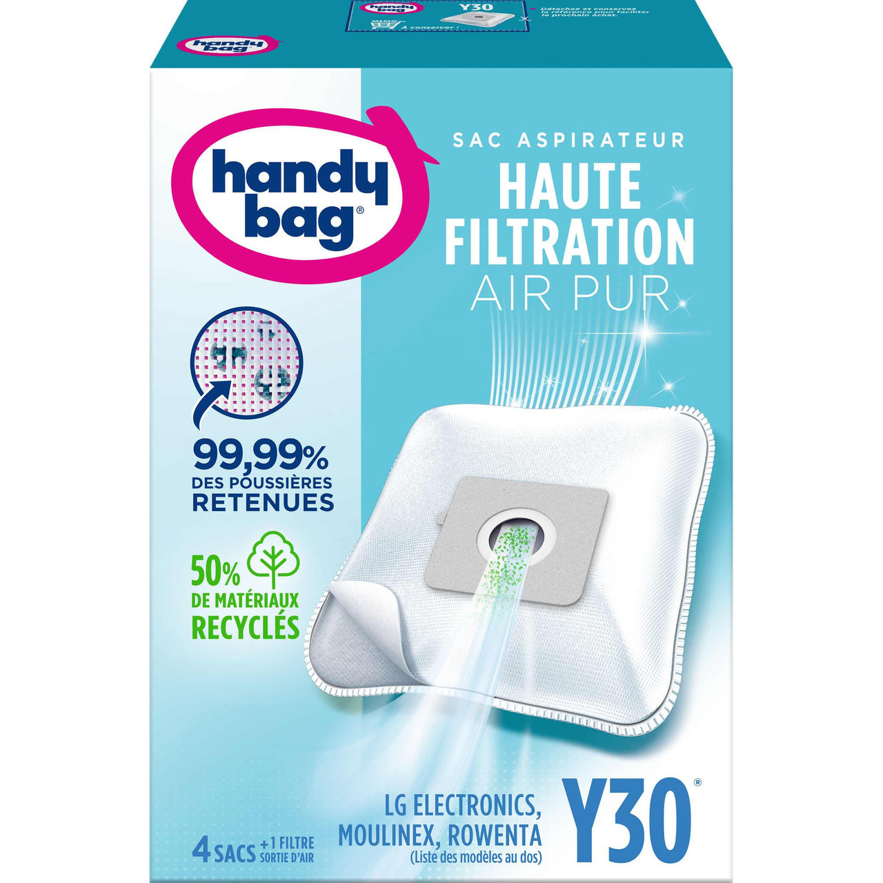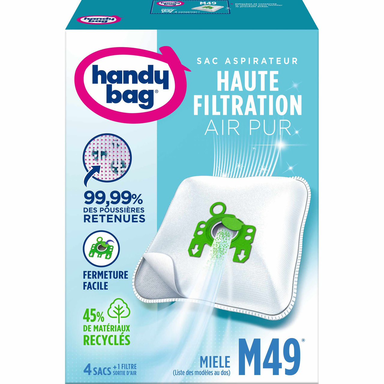 Nos sacs aspirateur Handy Bag® Haute Filtration vous garantissent une puissance d'aspiration maximale, et retiennent 99,99 % des particules de poussières les plus fines.