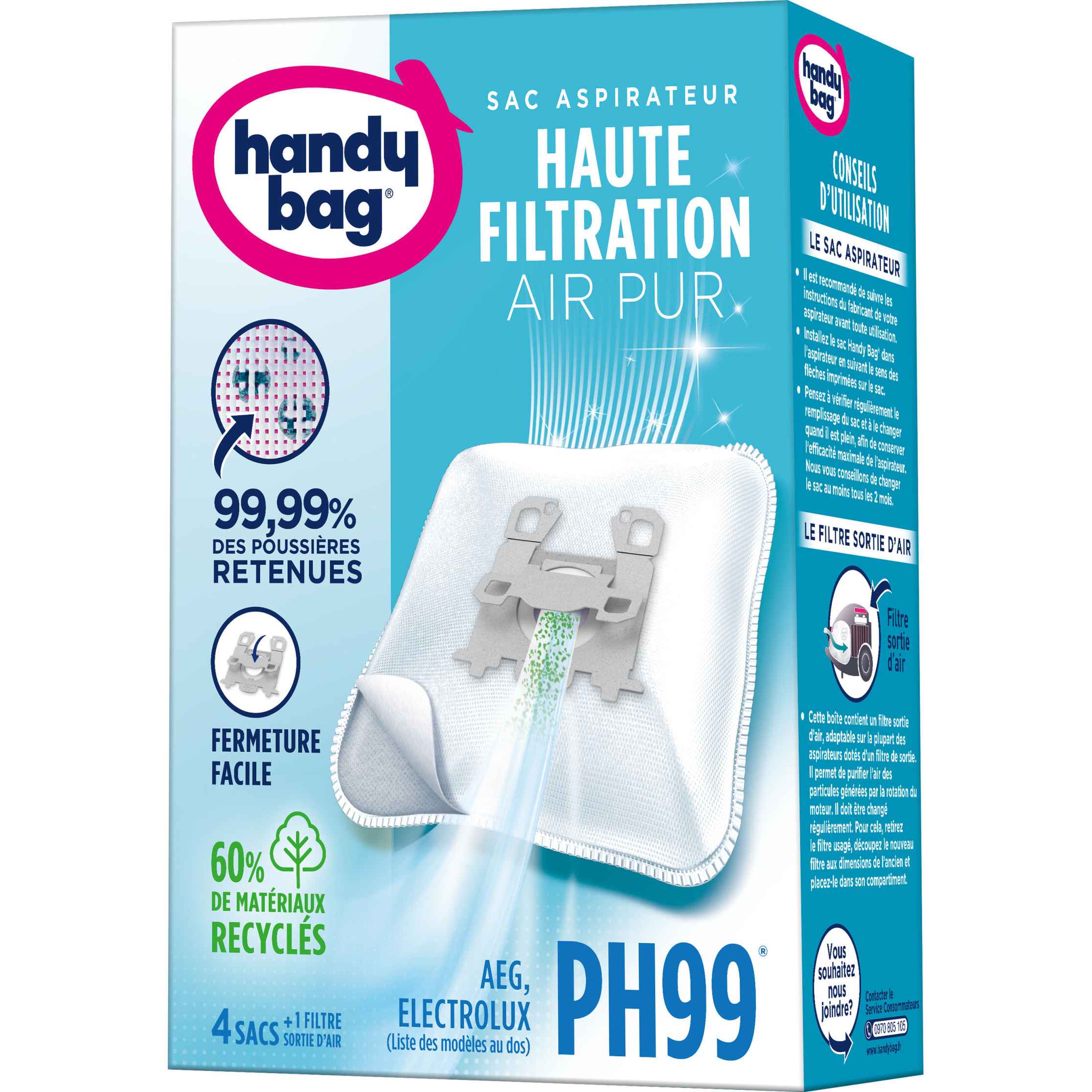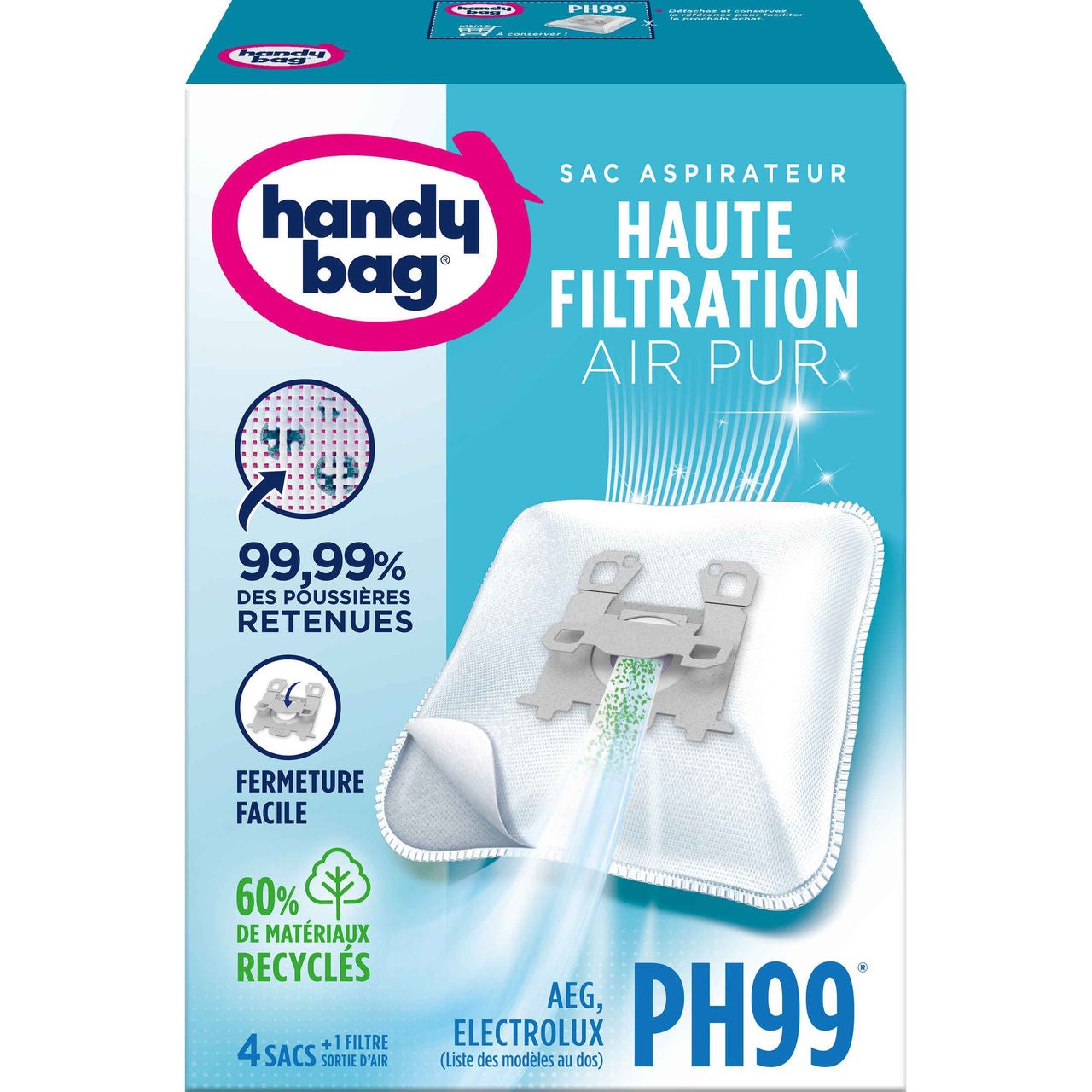Nos sacs aspirateur Handy Bag® Haute Filtration vous garantissent une puissance d'aspiration maximale, et retiennent 99,99 % des particules de poussières les plus fines.