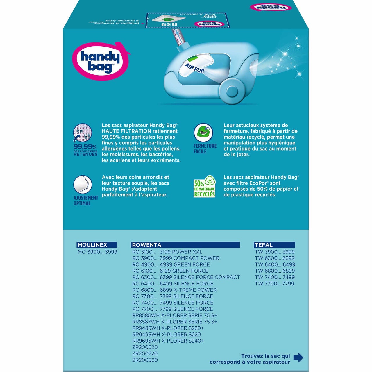 Nos sacs aspirateur Handy Bag® Haute Filtration vous garantissent une puissance d'aspiration maximale, et retiennent 99,99 % des particules de poussières les plus fines.