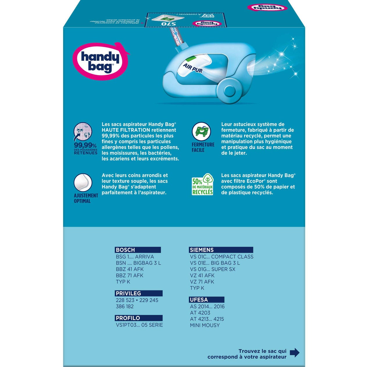 Nos sacs aspirateur Handy Bag® Haute Filtration vous garantissent une puissance d'aspiration maximale, et retiennent 99,99 % des particules de poussières les plus fines.