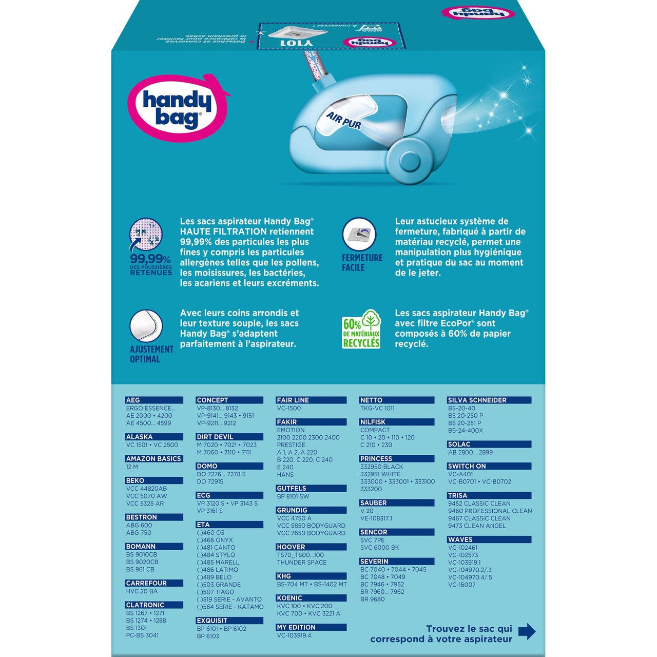 Nos sacs aspirateur Handy Bag® Haute Filtration vous garantissent une puissance d'aspiration maximale, et retiennent 99,99 % des particules de poussières les plus fines.
